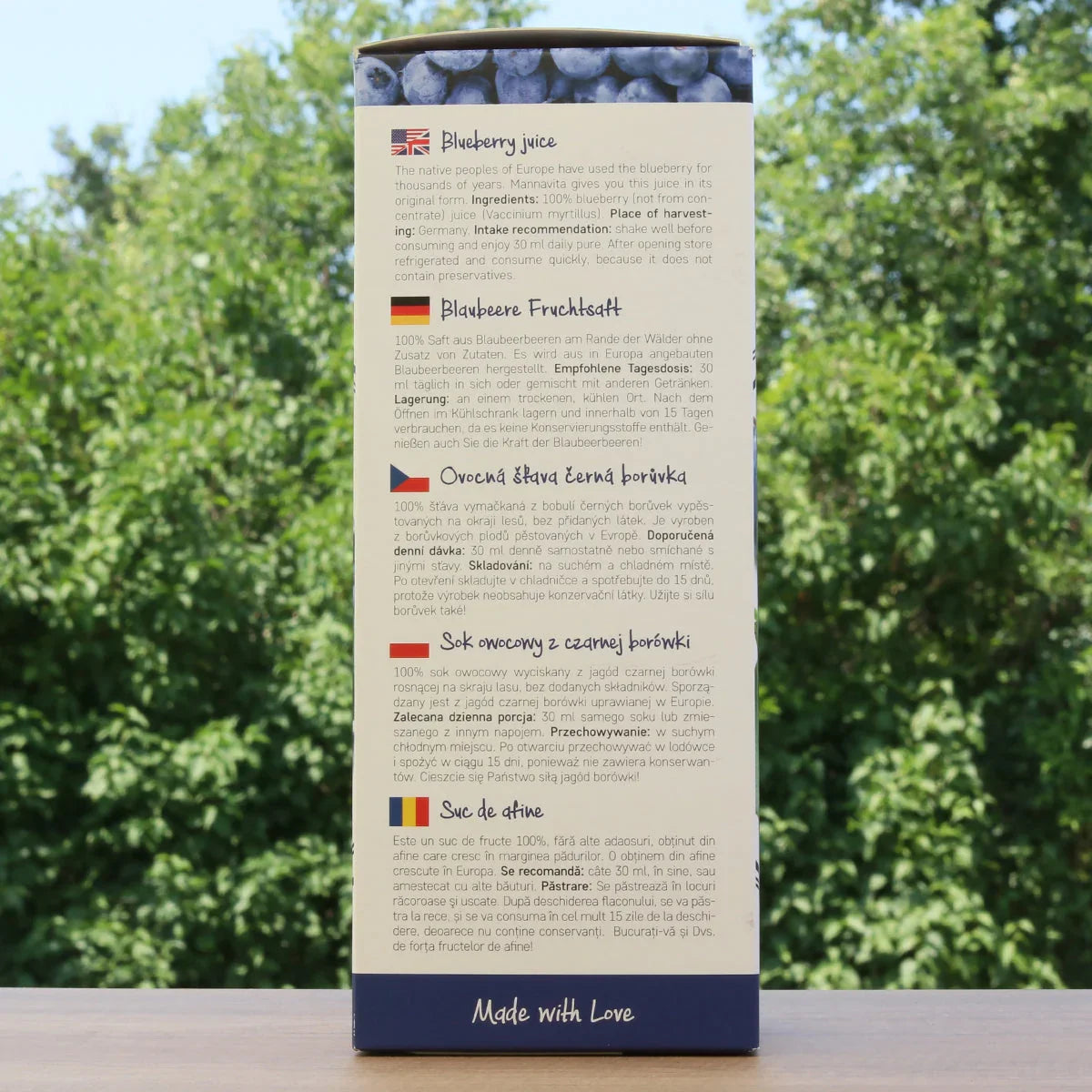 Mannavita 100% χυμός μύρτιλου είναι ένας άμεσος χυμός φτιαγμένος από μαύρα μύρτιλα (Vaccinium myrtillus) που καλλιεργούνται στην άκρη των δασών.