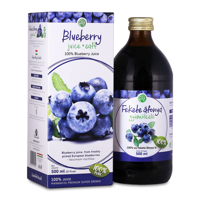 Mannavita χυμός από μύρτιλο με 100% περιεκτικότητα σε μύρτιλο. Φτιαγμένο από μαύρα μύρτιλλα - Vaccinium myrtillus - καλλιεργημένο στο άκρη των δασώνΗ ανθοκυανίνες σε αυτό έχουν μια ισχυρή προστατευτικό ματιών επίδραση. Ο χυμός από μύρτιλο διεγείρει κυκλοφορία του αίματος στο λεπτό, μικροσκοπικό τριχοειδή αγγεία σε όλο το σώμα. Τακτική κατανάλωση μύρτιλου βοηθά στη διατήρηση της σωματικής και πνευματικής φρεσκάδας και καλή μνήμη.
